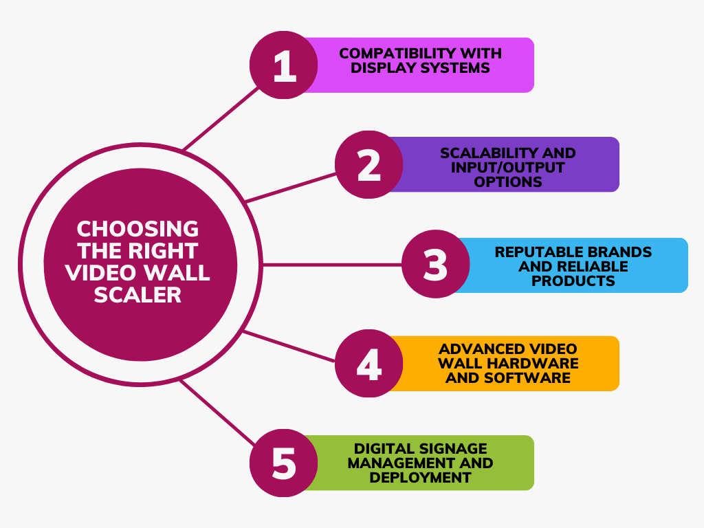 To choose the right video wall scaler, consider factors like input/output resolution compatibility, the number of screens, input source variety, and the scaler’s processing power. Evaluate features such as aspect ratio control, image adjustment, and connectivity options. Match the scaler’s capabilities with your display setup requirements for optimal performance.